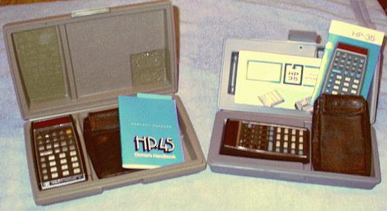 HP-35 and HP-45 in their transport cases with original manuals and leather cases.